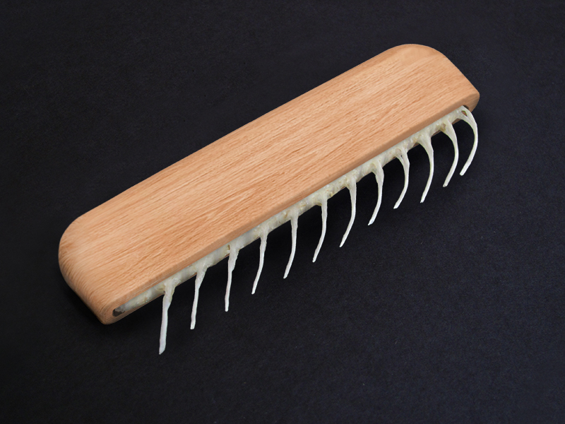 Primitive combs were made out of actual fish bones. I selected a bone and made it into a comb by attaching a wooden handle. I chose a Salmon bone for its sturdiness and flexibility. It was boiled and soaked in acid to remove fats and meat residue.