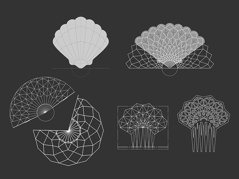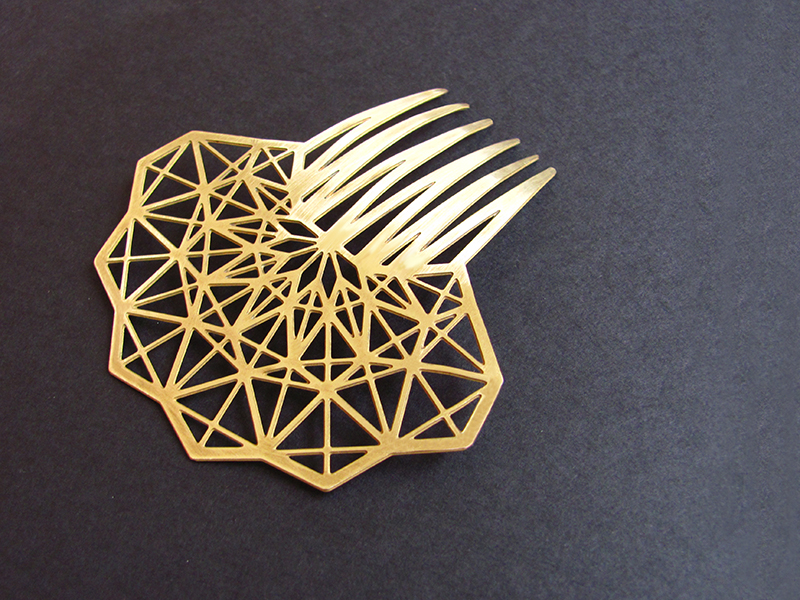 This decorational comb references the Andalusian comb Peineta. The Peineta is a hair ornament, customarily carved out of tortoise shell and worn by women. The origin of the Peineta goes back to the 19th Century in Spain. It was usually fashioned after seashells. I analyzed the shape of a scallop shell to understand its fractal nature. I deconstructed it into geometrical segments to arrive at the final pattern.